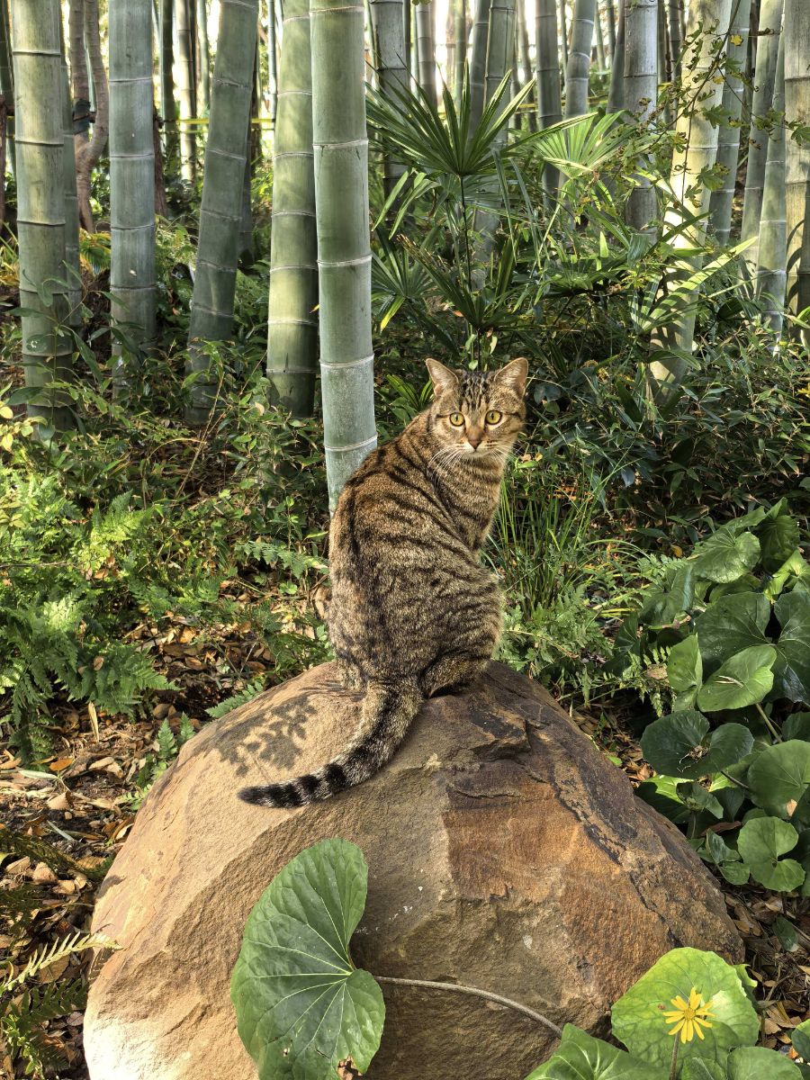 狸花猫先坐在石块上,低着头认真地舔舐爪子,虎斑纹的皮毛在阳光下泛着温润的光泽,胡须随着动作轻轻颤动;又背朝人蹲坐在巨石顶端,明黄的眼睛警惕又好奇地望向四周,仿佛成了竹林的“守护者”;就连被人轻轻抚摸头顶时,它也只是安静地蹲在石板路上,尾巴尖偶尔扫过地面。