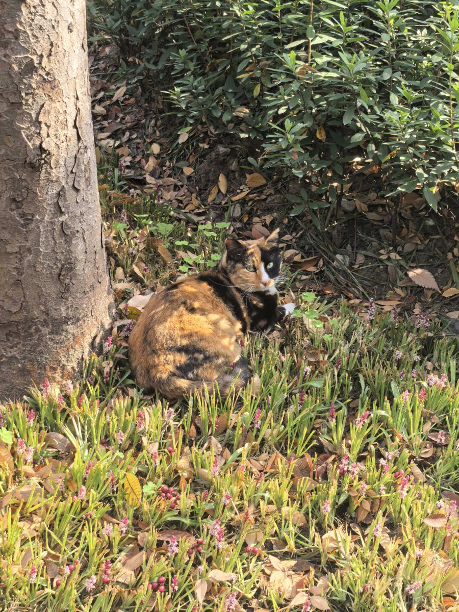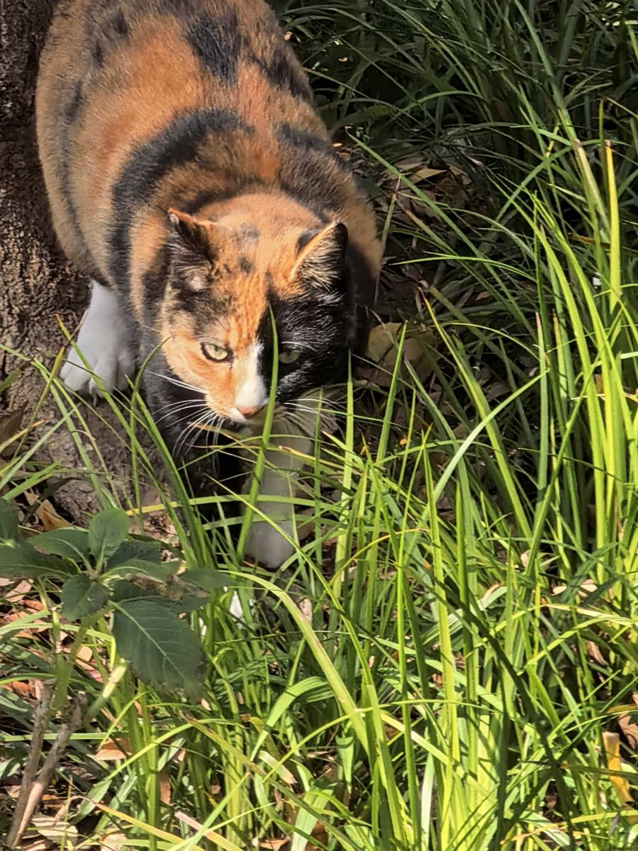 而三花猫则偏爱玩“躲猫猫”的游戏。一只倚着粗壮的树干,被层层绿植半掩着,眼睛在光影里忽明忽暗,慢慢从草丛里探身出来,尾巴高高竖起,小心翼翼地踩着青草往前走,专注的模样像是发现了什么有趣的小猎物;另一只藏在金黄的野花与宽大的绿叶间,只露出半张脸,眼神里透着几分狡黠,后又舒展身体趴在草地上,任由阳光洒在三色皮毛上,懒洋洋地眯着眼睛,仿佛把周遭的热闹都隔绝在外。