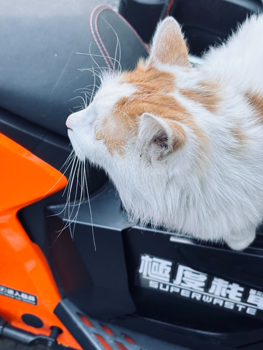 它总待在一辆橙黑配色的机车旁,要么蜷在车座的储物格里,把脑袋搁在边缘,要么就支棱着身子,鼻尖微微扬起,盯着来往的人群出神。橘色的毛在头顶和脊背晕开,像泼了一勺温温的蜂蜜,白色的绒毛裹着它的脸和肚皮,脏污的痕迹藏在毛发缝隙里,却丝毫不减它的灵动。