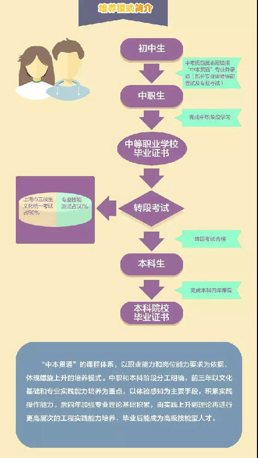 中职—本科贯通7年(“3+4”)、中高职贯通5年(“3+2”),近年来,上海职业教育“立交桥”,路越来越宽,已初步形成中职—高职—应用本科—专业学位研究生纵向完整的培养体系。