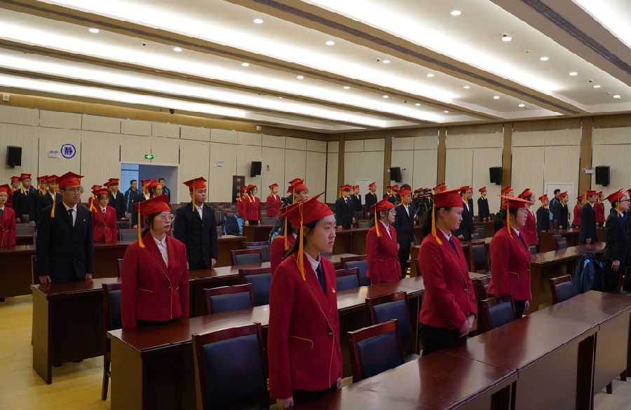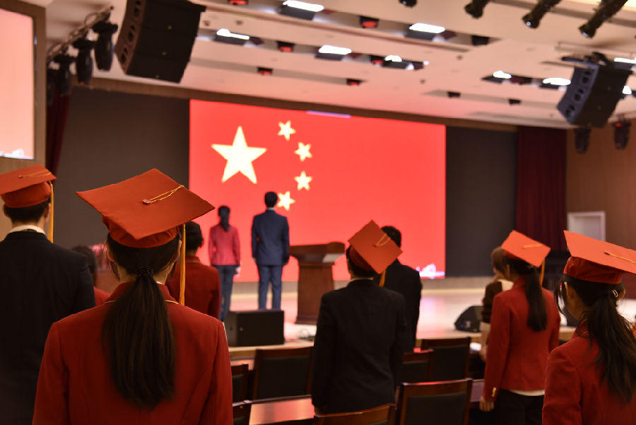 仪式在高昂的国歌声中开始,现场学生肃立,升国旗,奏唱国歌。
