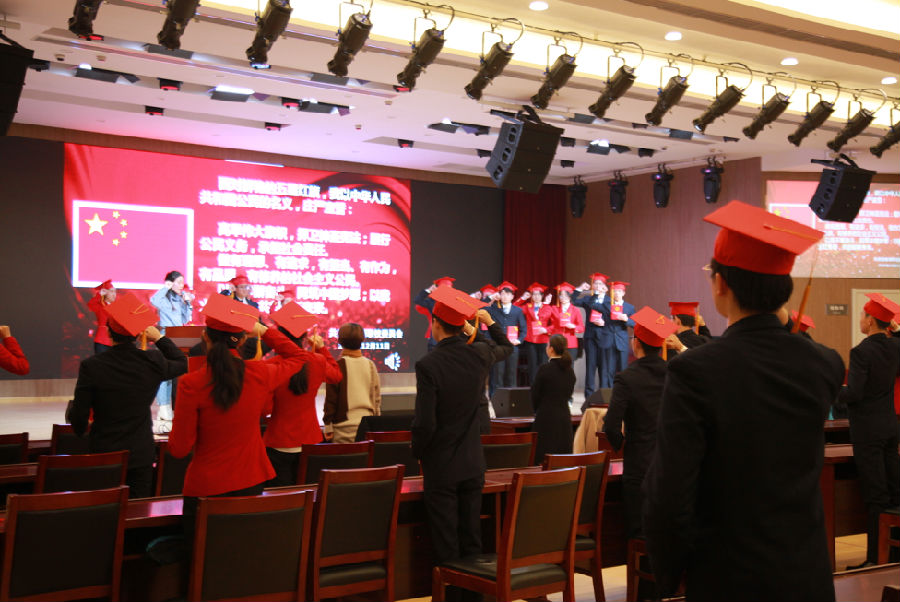 仪式进行第二项便是颁发宪法。由德育处主任达老师为学生代表们颁发了《宪法》。随后,仪式进行第三项——成人宣誓紧锣密鼓地跟上。在我校团委书记王韧冰老师的领誓下,全体18级的同学面对国旗,高举右拳,手持《宪法》,庄严宣誓:高举伟大旗帜,捍卫神圣宪法;履行公民义务,承担社会责任。做有理想、有追求,有担当、有作为,有品质、有修养的社会主义公民。以我不懈奋斗,同筑中国梦想;以我火红青春,共创崭新未来。