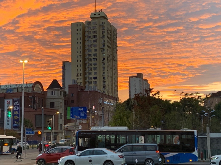 在回家的时候,抬眸发现了炙热如火的晚霞,天上的白云一层疊着一层,呈鳞状分布着。在落日余晖的照耀下,像是金子在天上发着亮光呢!晚霞的颜色瞬息万变,一会儿红彤彤的,一会儿金灿灿的,会儿又变成了淡紫色….些颜色还是生活中比较少见的,那是只有晚霞和朝才拥有的色彩。没过一会天就黑了,晚霞转瞬即逝,就像是从未来过。但在看见了它的人的记忆深处,又留下了浓墨重彩的一笔。似是点燃了的蜡烛,在熄灭前仍然以最美的一面照亮世界……