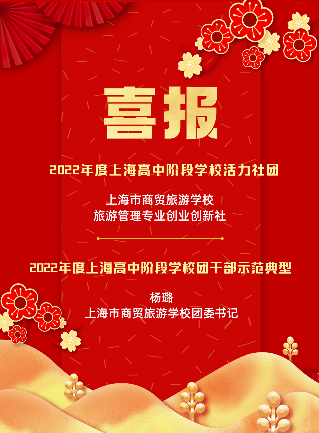 近日,在“2022年度上海高校、高中阶段学校活力团组织、活力社团、团干部示范典型选树”评选中,我校旅游管理专业创业创新社团荣获“活力社团”称号,杨璐老师荣获“团干部示范典型”称号。