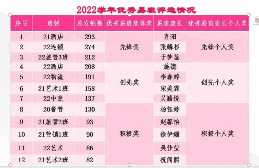 希望本次没有获奖的班级向优秀班级学习,多关注本专业特色、多呈现班级精彩活动,多参加易班线上线下活动,为校园生活点缀美好。期待以后有更多班级站上领奖台!工作总结表彰会。最后李老师勉励大家持续发有效帖,要求大家努力筑牢网络新阵地,营造清朗网络空间。会议由校