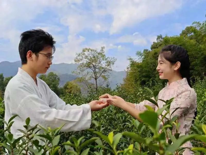 澄澈的天空映射着学子们激动的心情。同学们迫不及待的登上台阶,站定在贡茶院前往后瞧,便能俯瞰整条街道和远处的山脉。整座贡茶院坐落在群山之间,四周围绕着树木和竹林,像是停留在唐代的世外桃源。