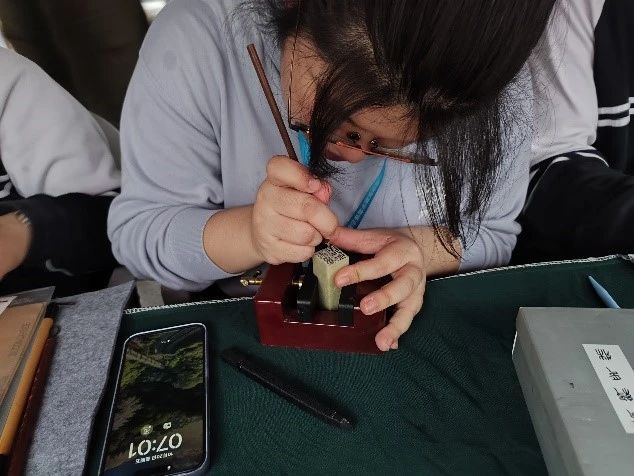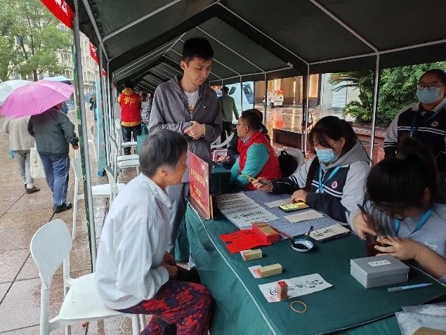 本次便民服务是由21文物1班负责,在班主任陆阳老师以及文物教研组嵇云、孙威两名党员老师的带领下,由梁佳盈、朱羿亚、任昕怡、王德婧、邢轩睿、刘耕硕和王择文七位同学组成的志愿者服务队,将通过自己所学的非遗技艺为市民提供颇具特色的服务项目——手工印章刻制和书法书签制作