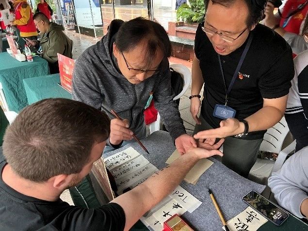 文物专业同学的志愿服务项目受到了广大市民的热烈欢迎,许多市民都争相来到了他们的服务摊位前,甚至还排起了队。让人意外的是,竟然还有几位外国友人,也带着好奇的眼神驻足排队。 交流之下,才知道原来他们是来自欧洲的游客,希望亲自体验下中国的中国传统非遗文化。为了更好的“体验”,外国友人让请志愿者们把他的名字“Tedi”直接用毛笔写在他的手臂上——可能是想跟传统的羊毫来个亲密接触吧。为了不让外国友人失望,孙威老师就挥毫落墨在他的小臂上写下了他的名字。随后,Tedi自己还用毛笔自己又体验了一下,然后带着满意的笑容向朋友们频频展示——他与中国非遗技艺的亲密接触留下的痕迹。