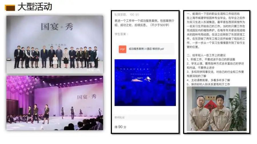同学们通过“工作篇、成长篇、展望篇”三部分回顾了10周进入校企合作8家企业的学习经历与各种收获。四位同学梳理了酒店各部门的岗位流程,分享自身对努力成为“职场人”所具备的核心能力的理解。两位同学从获得感和挫折感双面PK,用讲故事的方式展现同学们企业实践中:参与国宴秀、用外语待客服务、推介企业文化获得好评的优秀案例,以及“茅台瓶”“两小时监控”改进型案例,起到了自我内化教育的意义。据学生问卷反馈:岗位实践后,有90%学生仍然觉得自己比较适合该专业,愿意到酒店业发展,从事前厅管理、客房管理、餐饮管理,行政管理方面工作。可见,此次岗位实践对学生了解企业、选择职业发展方向起到了非常积极的作用。