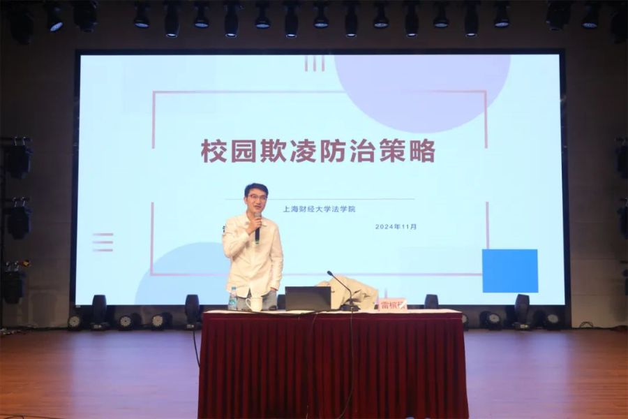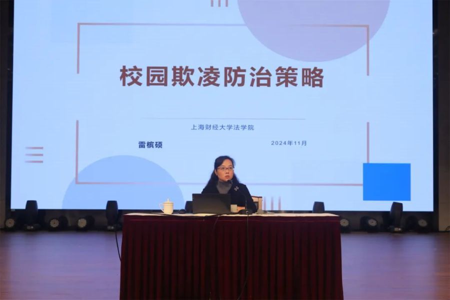 为进一步筑牢校园安全防线,持续做好学生欺凌防治工作,营造和谐安全的校园环境。11月4日下午,学校组织开展了题为“校园欺凌防治策略” 预防学生欺凌法治专题讲座,全体教职工参加活动。讲座由教育部青少年法治教育协同创新中心研究员、上海财经大学法学院讲师、法学博士雷槟硕老师主讲,校党总支副书记、校长冯燕飞主持大会。
