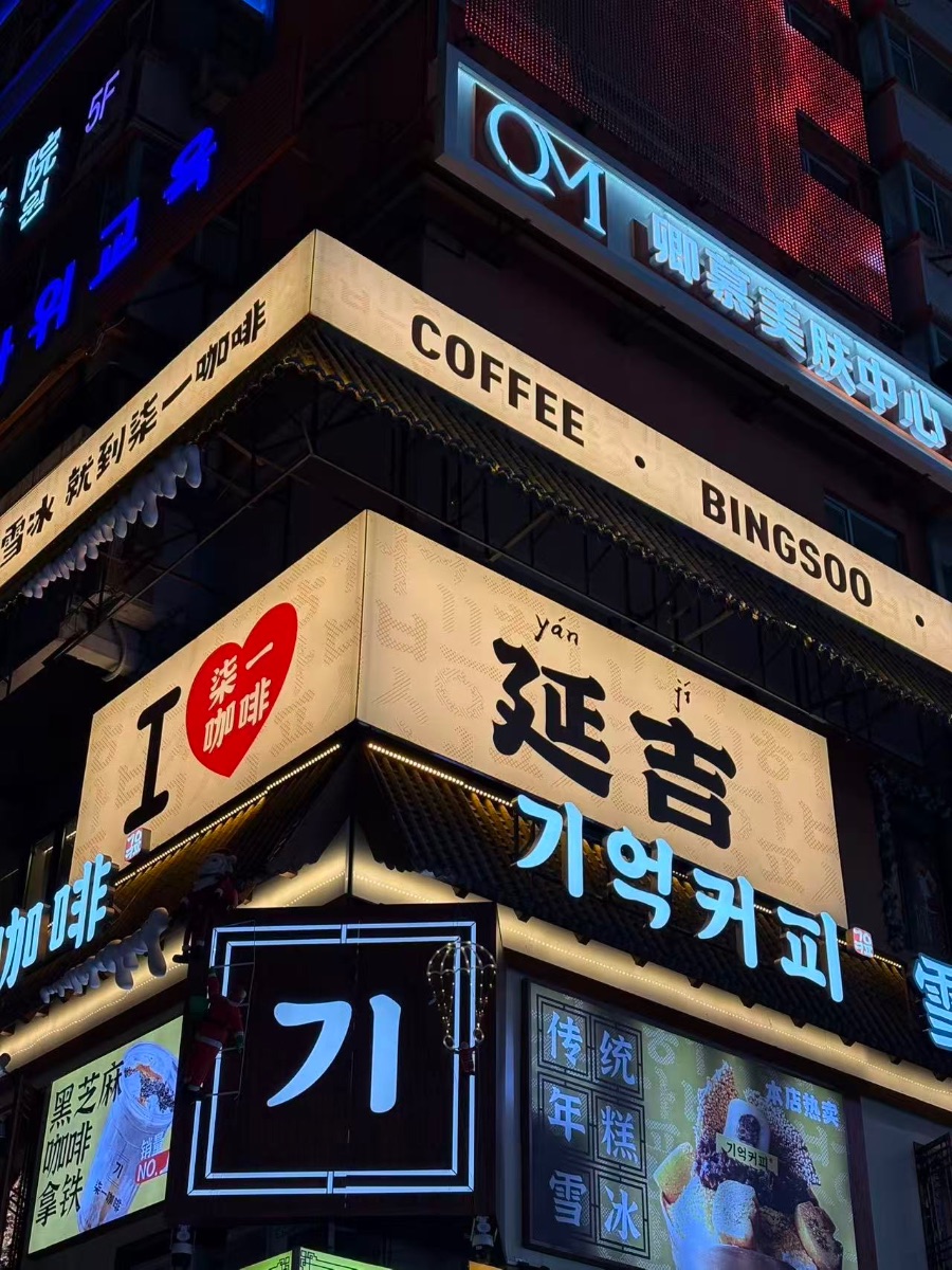最经典的机位在斑马线中间。手捧一杯印着“延吉”字样的后浪咖啡,以霓虹灯墙为背景,镜头定格的瞬间,车流、灯火、双语招牌和你,一起构成一张氛围感拉满的照片。游客们举着咖啡排队拍照,小贩推车售卖氢气球,情侣在灯下牵手依偎。