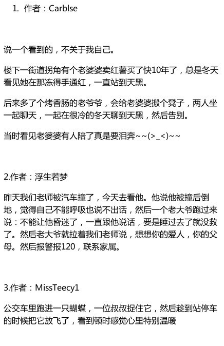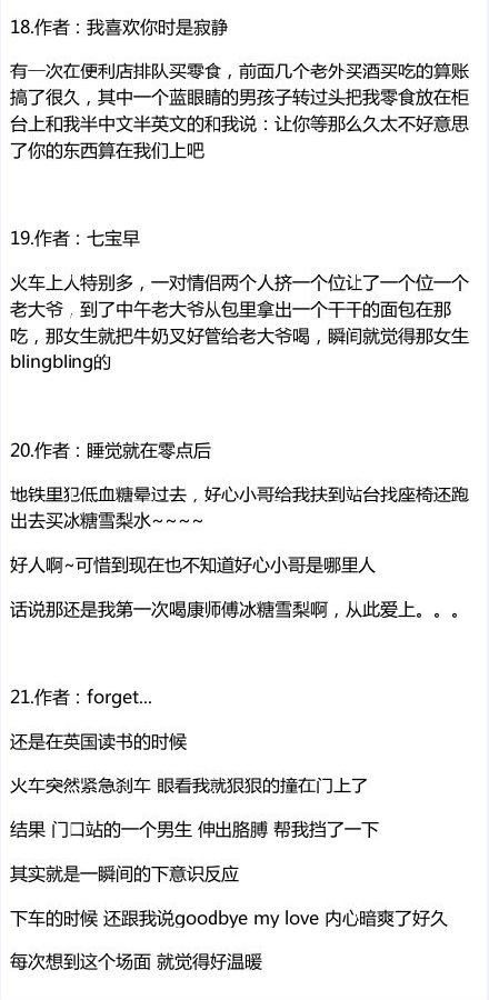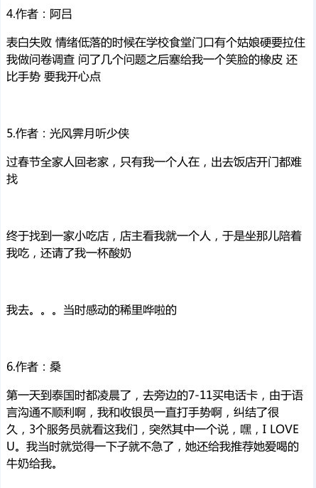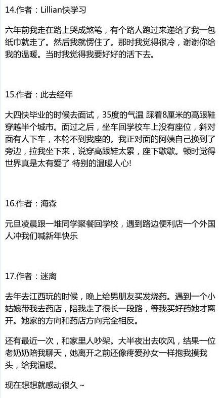 一个小小的举动,一句简单的话语,可能就会带给人温暖和感动,带给人鼓舞和力量,带给人很长时间乃至一生的温暖回忆。我们一起来聊聊那些曾经被陌生人温暖感动的瞬间吧。