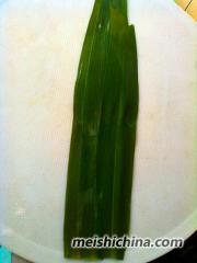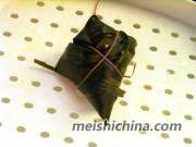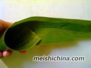 9、把尾部拉过把米遮盖住看图,粽叶绕缠着。