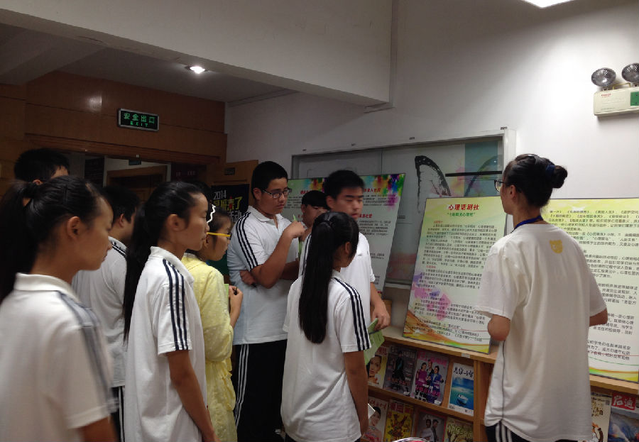讲解员为新生们讲解学校的社团活动情况,大家都在认真的听。